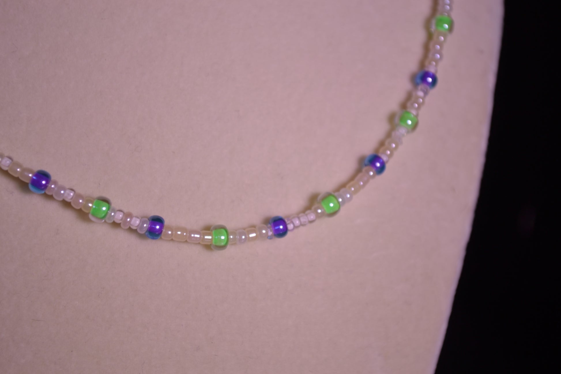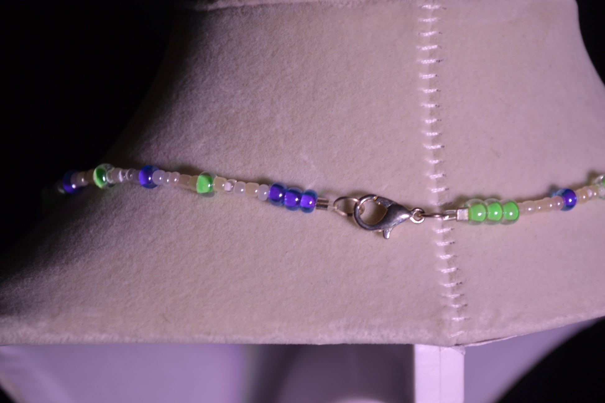 Purple, green, and whote glass beads with a lobster clasp close